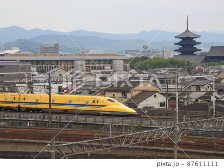 秋の京都市内を行く東海道新幹線ドクターイエロー