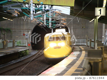 ドクターイエローがトンネルを出てすぐに山陽新幹線新神戸駅のホームへ入線