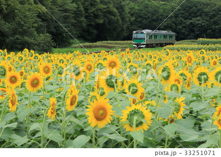 烏山線「森林の中のひまわり畑を走る列車」夏空背景に