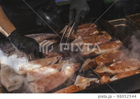 大きなイカ焼きの屋台 湯気を上げて焼かれるイカ