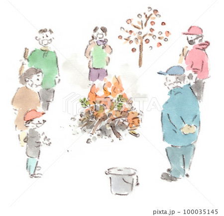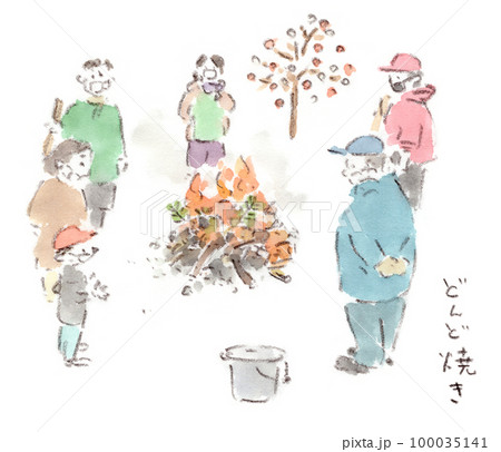 正月行事、どんど焼き。焚き火にあたる人たち。コロナ禍で皆んなマスク着用している。水彩スケッチイラスト