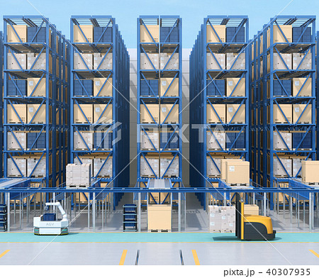 大型自動物流センターのインテリアイメージ。AGV無人搬送車、無人運転フォークリフトによる効率化