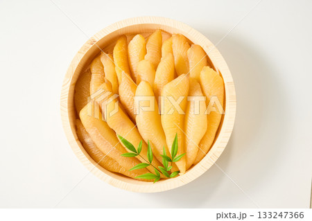 無漂白・無加工の数の子を木樽に盛り付けた日本の伝統食(白背景)