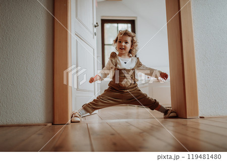 Red-haired baby standing in knitted outfit near bed and Christmas tree, front view