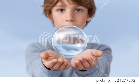 Environment impact and awareness, pollution concept, A boy holds a crystal-clear bubble in his hands, looking curious.