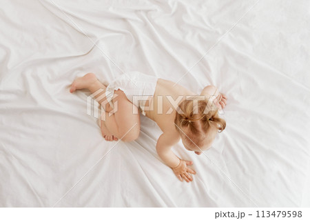 Active, smiling, little redhead girl, toddler in diaper lying on belly on bed, laughing, playing on white bedsheets. Happiness, fun and joy
