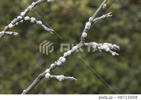 ハナミズキの枝に寄生するカイガラムシ