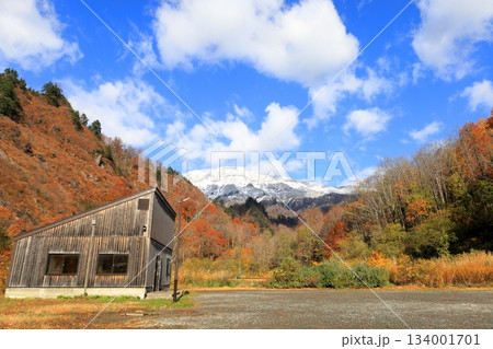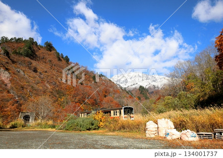 只見線 田子倉無料休憩所から見える秋の六十里越トンネル(福島県只見町、10月)