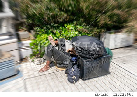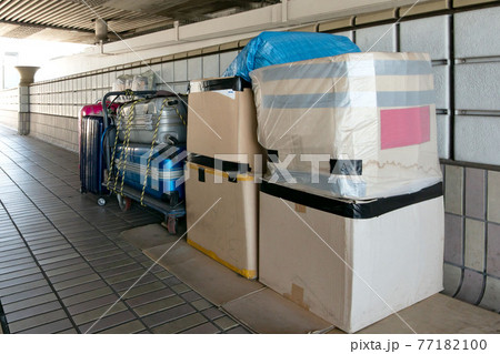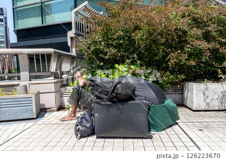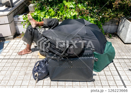歩道上に置かれたホームレスの荷物とホームレス