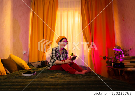 Girl wearing casual shirt texting in orange glowing room. Concept of after school relaxation. Low angle view