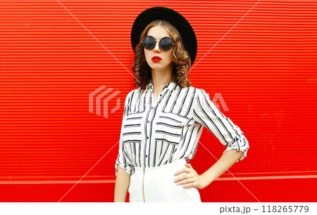 beautiful young woman model wearing white striped shirt, black round hat posing on red background