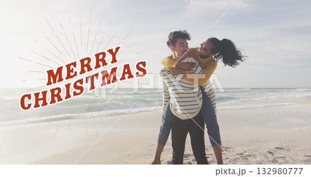 Carrying woman on back on sandy beach wearing casual clothes, with red MERRY CHRISTMAS text
