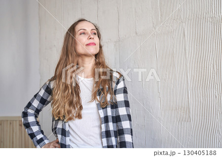 Portrait of a young woman with vibrant color accents in a minimalist studio setting, captured during afternoon light