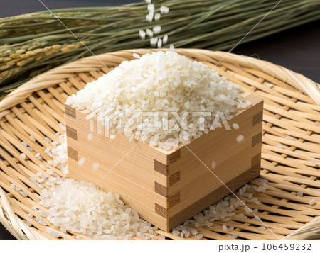 新米のイメージ。パラパラと枡に落ちる米。