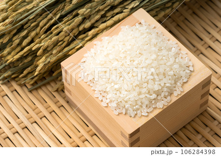 枡に入ったお米と稲穂。新米のイメージ。