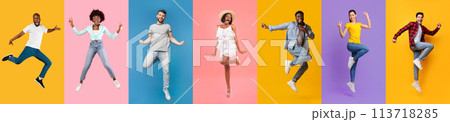 Energetic Group of Young Adults Jumping Against Vibrant Colorful Backgrounds