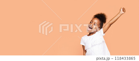 A little black girl with curly hair and a bright smile raises her arm in celebration against a peach-colored background. She is wearing a white t-shirt and appears to be full of joy and excitement