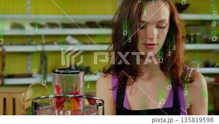 Juice attendant in purple top and apron blending fruit in juicer behind counter, green code overlay