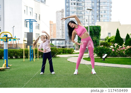 Woman and girl exercising together in a park with city skyline in the background during daytime