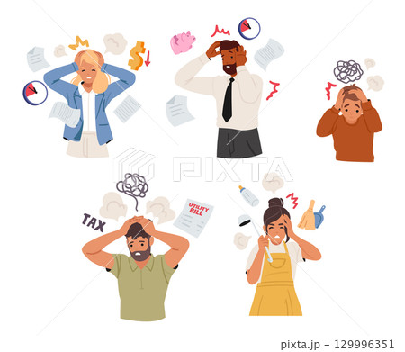 Diverse people cartoon characters feeling scared and panic having life and business troubles