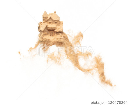 SandCastle fly over sand explosion as high risk and easy to collapse, uncertain house structure is fragile gambling of disaster metaphor, white background isolated