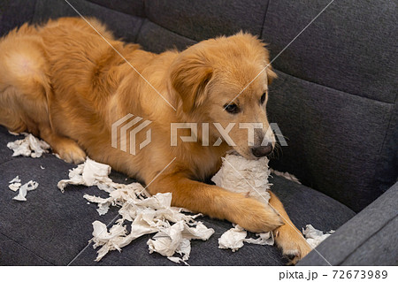 Naughty golden retriever puppy dog bite tissue paper on sofa