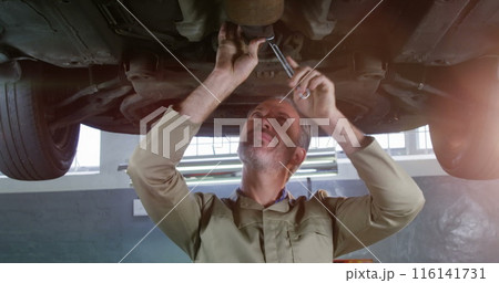 Caucasian mechanic working under car, holding a wrench