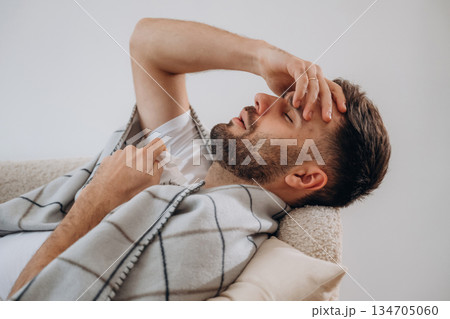 Tired, having headache. Male freelance worker is using laptop at home. Cozy apartment