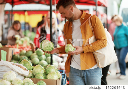 Choosing cabbage. Handsome man is on the street market or bazaar
