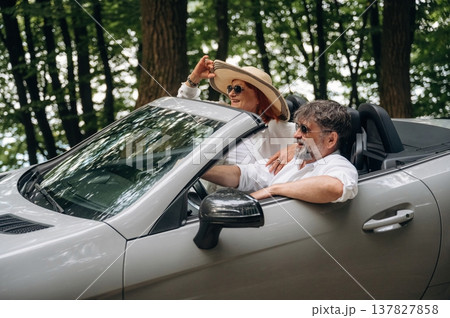 Comfortable vehicle, vacation conception. Senior couple driving convertible cabriolet car