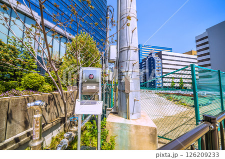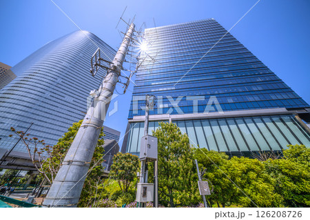 日本の東京都市景観 街中の防災…。住友不動産浜離宮ビル近くにあるAM受信混合器,などを望む