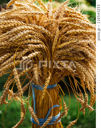 Upright wheat bundle tied neatly with ribbons amidst a garden setting.