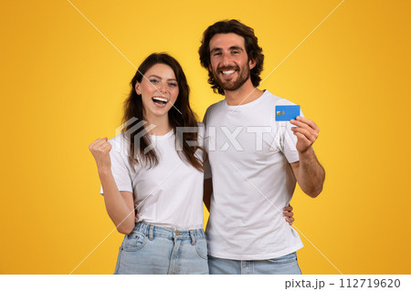 Cheerful young woman and bearded man celebrating, with the man holding a blue credit card