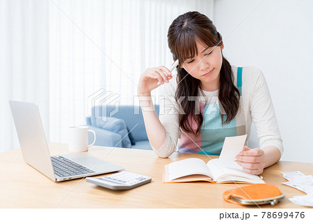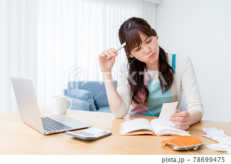 レシートを確認しながら家計簿をつけ家計のやりくりに悩む女性