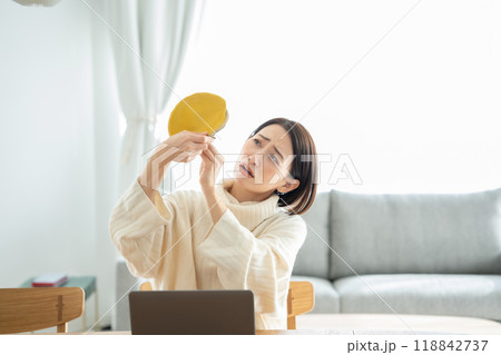レシートを確認しながら家計簿をつけ家計のやりくりに悩む女性