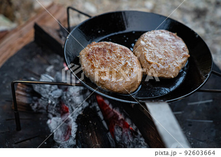 たき火 焚火台 焚き火調理 ハンバーグ 無骨 野営 キャンプ飯
