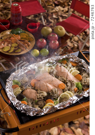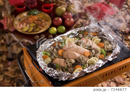 鮭のホイル焼きをバーベキューコンロで焼く