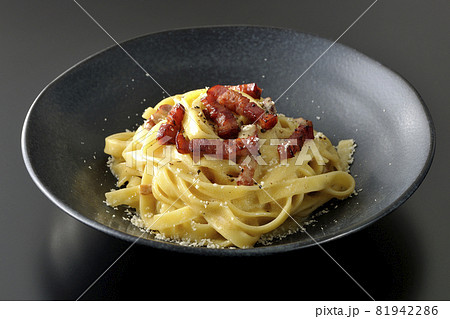 卵黄やカリカリに焼いたベーコンが入っているフェットチーネのカルボナーラを黒背景で撮影