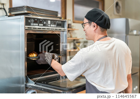 カフェ・ベーカリー・飲食店のオーブンでパンを焼く調理師の男性