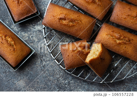 お皿に盛りつけられたカットされたカヌレ 洋菓子