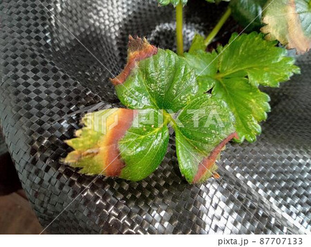 部分的な変な枯れ方をした葉。肥料焼けしたイチゴの葉っぱ