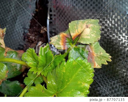不自然な枯れ方。肥料焼けしたイチゴの葉っぱ