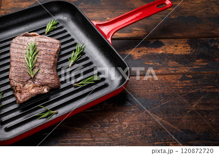 Grilled beef Top sirloin steak or Rump steak in grill pan. wooden background. top view