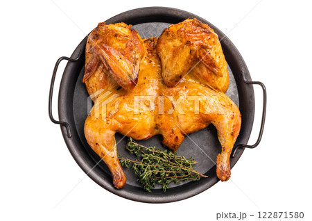 Roast Spatchcocked Chicken, poultry meat with herbs and spices isolated on white background. top view