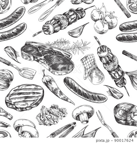 Seamless pattern with grilled meat products and BBQ utensils vector illustration.