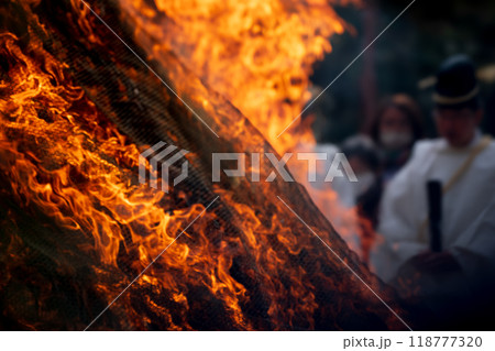 八幡のはちまんさんで実施される立ち上る炎の焼納神事を撮影