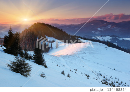 Winter scenic mountain landscape at sunset.