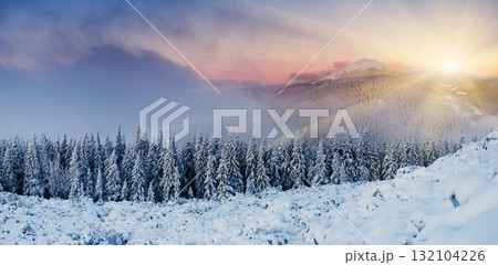 Winter forest at sunset. Trees covered with snow. Winter nature. Christmas background