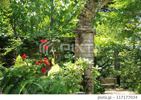 レンガのアーチがある庭園