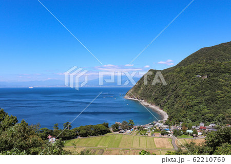 井田から望む、海越しの、青い空と海と青い海と富士山